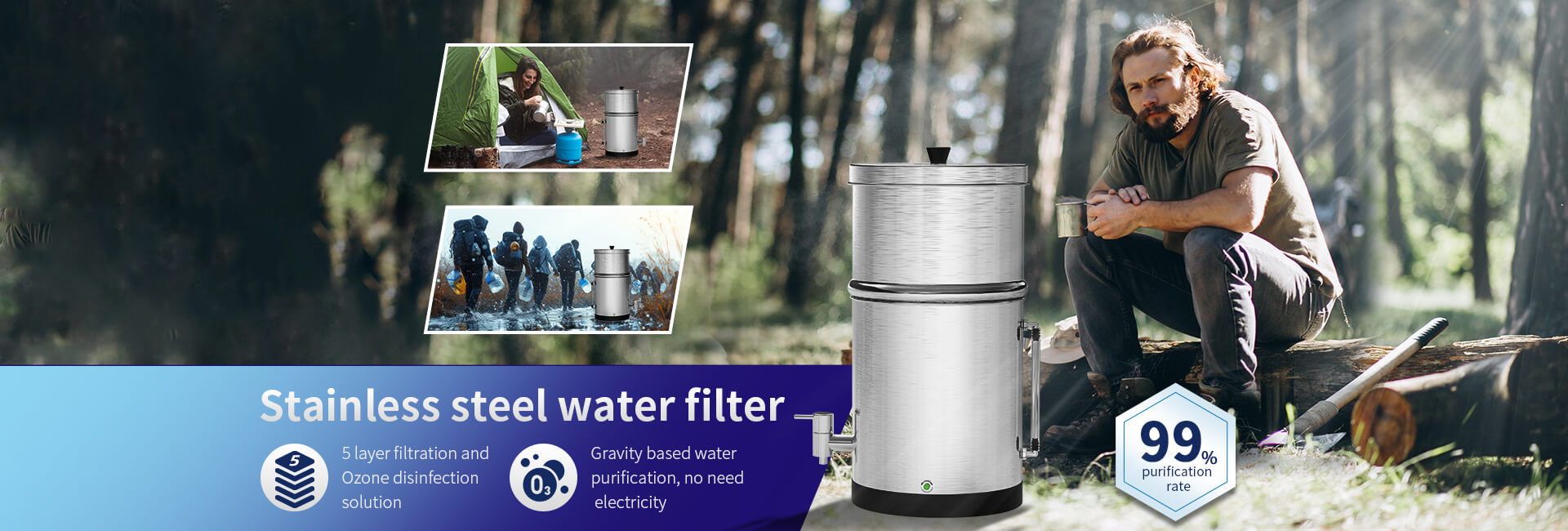 The ozone and gravity fed stainless steel water filter is our new innovation products, the traditional gravity fed stailess steel water intergrated with ozone disinfection function.