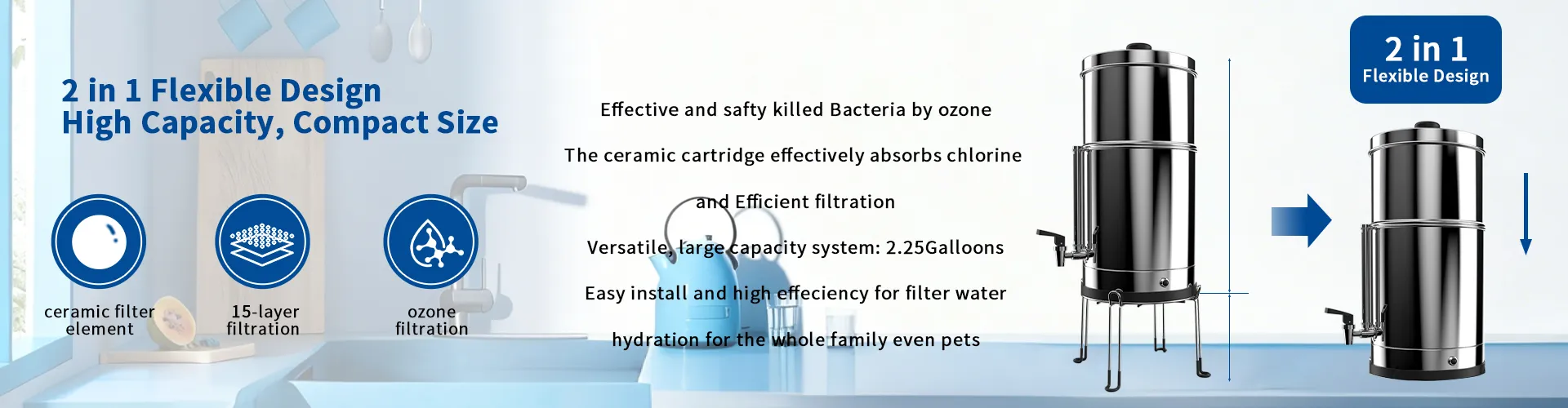 Both small reverse osmosis and stainless steel gravity filters are suitable for household use. Reverse osmosis produces wastewater and concentrate, while gravity filtration does not produce wastewater. RO reverse osmosis has requirements for influent water quality and requires frequent filter replacements and is more expensive. Gravity filters include ozone sterilization, which removes bacteria from the water without causing secondary pollution. It allows for immediate filtration and drinking without the need for water storage.